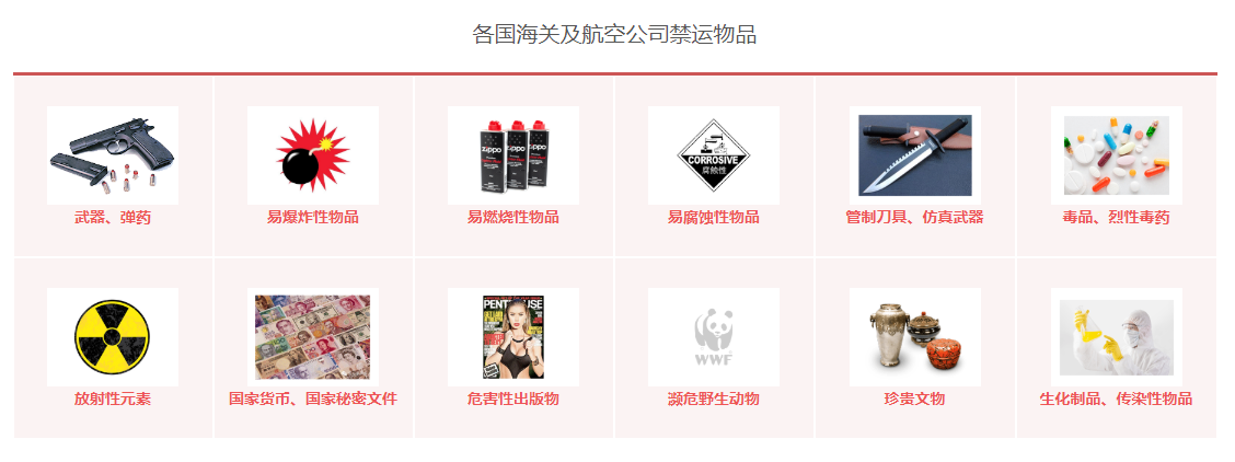 8.枪支、弹药、军队用品,任何刀具、危险品枪炮、剑、武器、兵器、机器、火药类、爆炸物、有毒物、有毒化学物品、放射性物品;